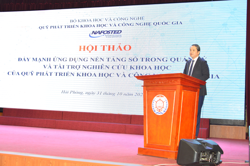 Đại diện lãnh đạo Quỹ NAFOSTED gửi lời cảm ơn chân thành tới Trường Đại học Hàng hải Việt Nam đã đồng hành, hỗ trợ và tạo điều kiện thuận lợi để Quỹ tổ chức Hội thảo, góp phần thúc đẩy hoạt động nghiên cứu khoa học. Đồng thời, Quỹ khẳng định sẽ tiếp tục khuyến khích cán bộ, giảng viên của Nhà trường tham gia các chương trình nghiên cứu do Quỹ tài trợ, coi đây là hướng đi quan trọng nhằm nâng cao năng lực nghiên cứu, đổi mới sáng tạo và tăng cường hội nhập quốc tế trong thời gian tới.