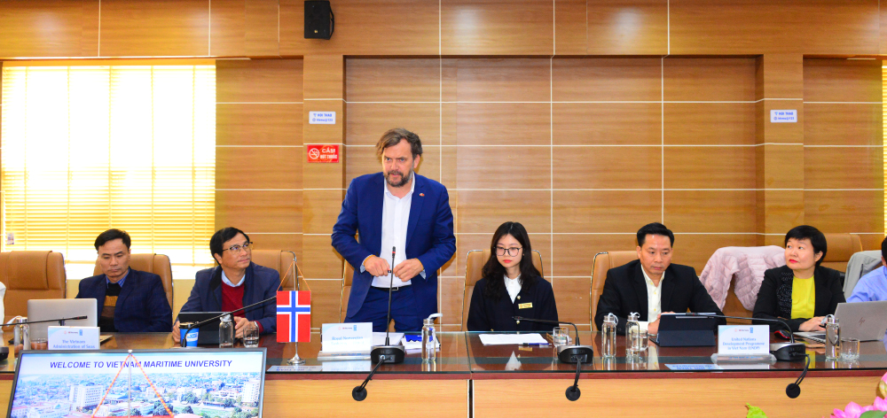 Đại diện Đại sứ quán Na Uy tại Hà Nội, Bí thư thứ nhất Erlend Skutlaberg, đã bày tỏ lời cảm ơn sâu sắc trước sự đón tiếp chu đáo, trọng thị của Trường Đại học Hàng hải Việt Nam. Ông đồng thời chia sẻ những kinh nghiệm của Na Uy trong quá trình xanh hóa ngành hàng hải, trong đó đặc biệt nhấn mạnh vai trò của việc ứng dụng khoa học - công nghệ gắn liền với sự phối hợp chặt chẽ giữa các bên liên quan nhằm hướng tới phát triển bền vững.
